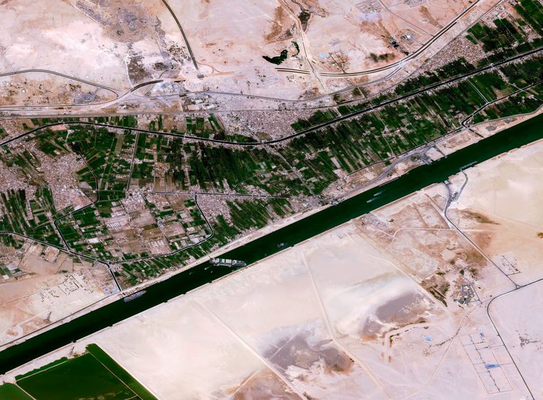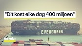 Gigantische opstopping op suezkanaal door containerschip met bestemming rotterdam.